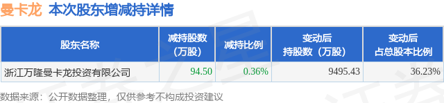 证券之星消息,12月2日曼卡龙发布公告《曼卡龙:关于控股股东减持计划届满暨实施情况的公告》,其股东浙江万隆曼卡龙投资有限公司于2025年9月5日至2025年9月9日间合计减持94.5万股,占公司目前总股本的0.3606%,变动期间该股股价上涨3.85%,截止9月9日收盘报24.01元。