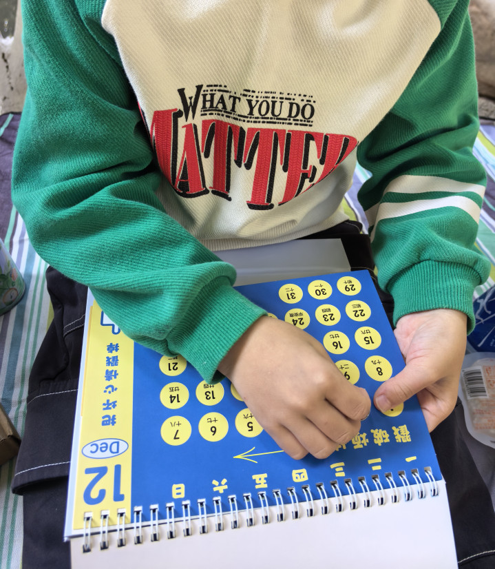 我试图安慰他,但是有些事在外面看来很小,对孩子来说就是过不去,我发现安慰没用。后来二宝自己拿出了《解压日历》,二宝就把那天给抠下来了,扣下来后他就好了,他说“把这不开心的一天丢弃,就就开心了”,看吧?孩子的脑回路跟我们不一样,他们快乐的点也不同。
